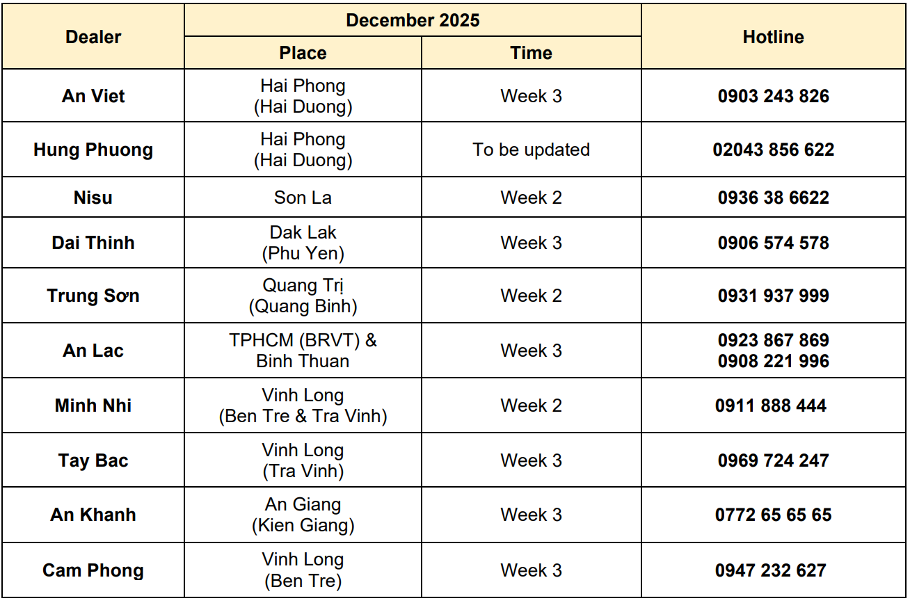 To thank Customers for trusting and using our products, with the desire to accompany and take care of the vehicles to operate in perfect condition, ISUZU Vietnam would like to inform Customers of the schedule of Mobile Service events in December 2025.