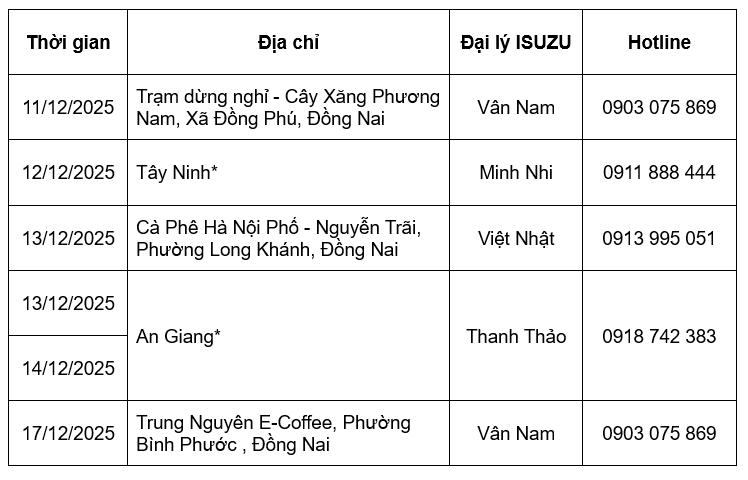 Hãy lưu lại lịch sự kiện Trưng bày & Lái thử xe tháng 12 – 2025 của ISUZU dưới đây và liên hệ với hotline của Đại lý để biết thêm thông tin chi tiết!