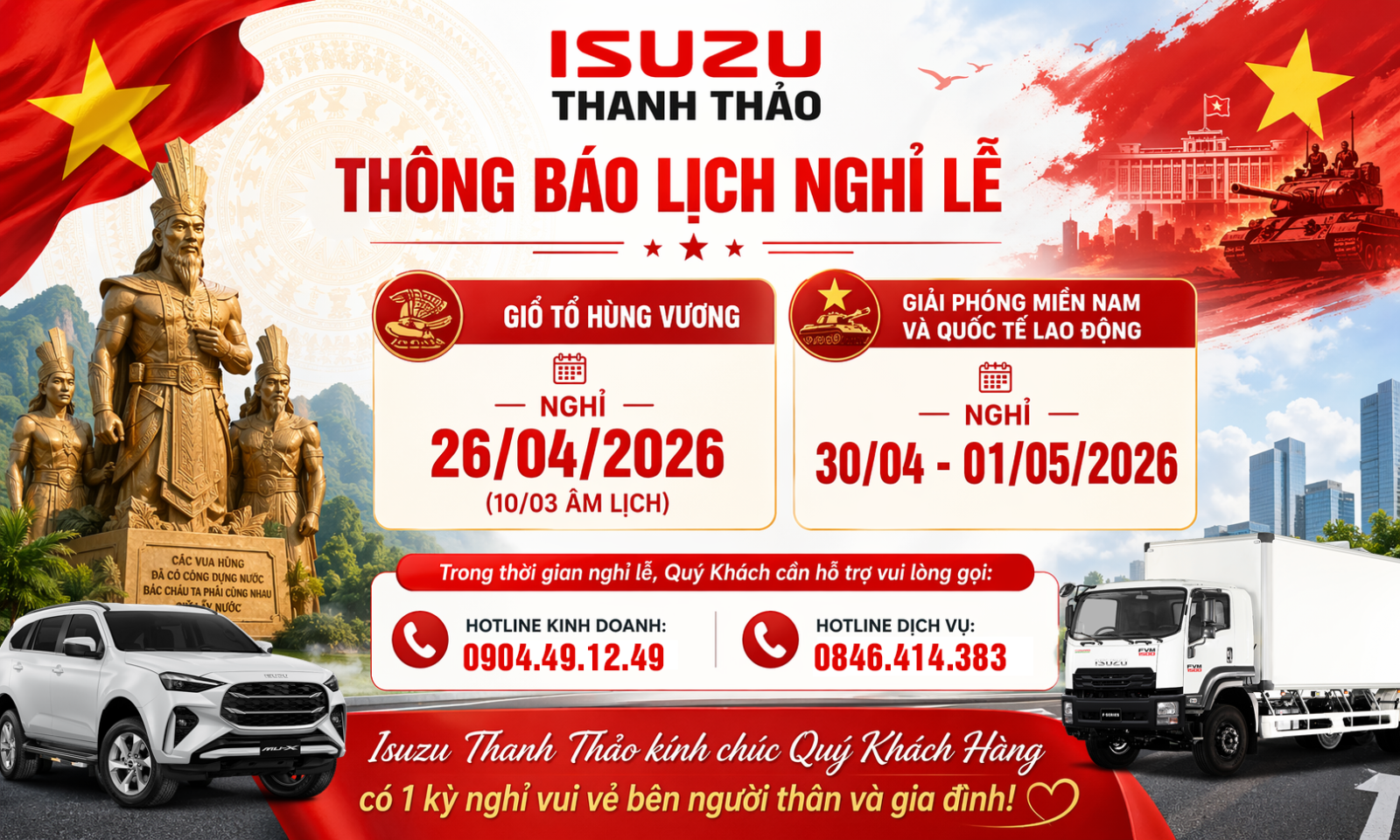 Isuzu Thanh Thảo xin trân trọng thông báo lịch nghỉ lễ như sau: