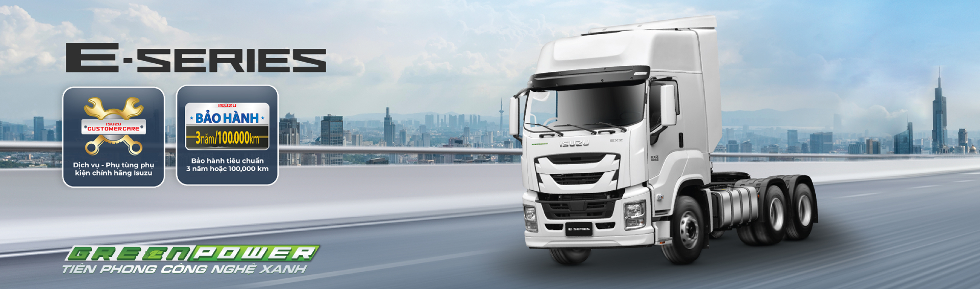 E-Series là dòng xe đầu kéo cao cấp của ISUZU, được phát triển nhằm đáp ứng nhu cầu vận chuyển đường dài. Thế hệ mới của E-Series được trang bị động cơ 6WG1/6UZ1 đạt tiêu chuẩn khí thải Euro 5 cùng hộp số 16 cấp, mang lại khả năng vận hành mạnh mẽ và ổn định. Thiết kế cabin khí động học giúp tối ưu luồng không khí khi kéo theo container, giảm đáng kể mức tiêu hao nhiên liệu. Bên trong, khoang lái được tạo hình bán nguyệt độc đáo, mang đến không gian rộng rãi, thoải mái và tầm nhìn bao quát hơn cho tài xế.